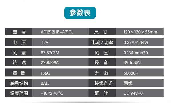 ADDA AD1212HB-A71GL 12V 0.37A 12厘米2線風機